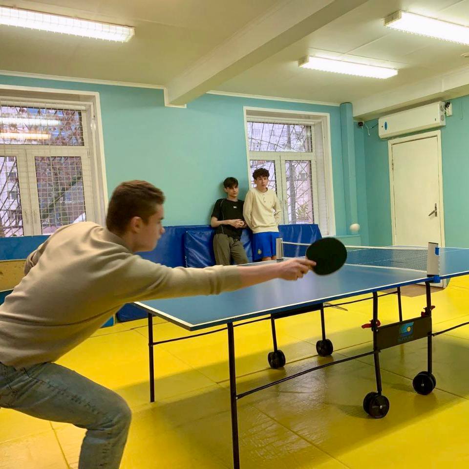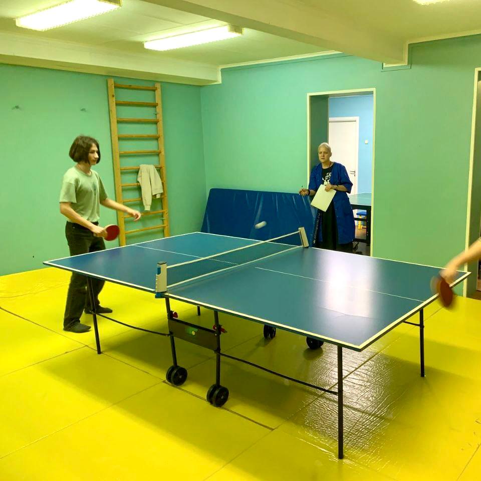 Настало время настольного тенниса — мы уже начали турнир. Ребята проводят перемены в игре, вокруг собираются зрители и команда болельщиков.